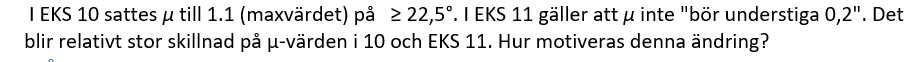 Fråga 2): Figuren i EKS är något svårtolkad, då taklutning bara anges för en sida av taket. Figuren och värdena i EKS är hämtad från Boverkets handbok för snö- och vindlast BSV 97. I figurtexten i BSV 97 står det att ”för icke-symmetriskt sadeltak bör varje takhalva behandlas som ena halvan av ett symmetriskt tak”. Hur detta ska tolkas är inte heller helt tydligt. En möjlighet är att dimensionera den ena halvan för ett symmetriskt tak med den takvinkeln (och husbredd) och den andra halvan för ett symmetriskt tak med den takvinkeln (och husbredd). I taknock får man väl välja den av dessa som ger störst belastning. I vardera fallen ska man då anta att vinden kan driva snön i två riktningar, vilket ger totalt fyra lastfall att beräkna.