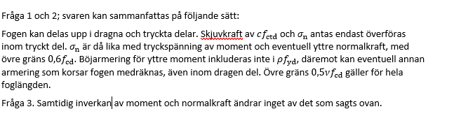 Fråga: Är det möjligt att ta hjälp av friktion för att nå upp till tillräcklig kapacitet för kopplingar med avseende på robusthet. Om det till exempel finns krav på att balk och kantpelare ska knytas ihop för en kraft vinkelrätt balkriktning på 150 kN. Skulle det då vara möjligt att dela upp kraften så att viss kraft tas av friktion, eller måste hela kraften tas av en mekanisk koppling. Frågan gäller också förr förankring inre dragband mellan bjälklagsplatta och vägg