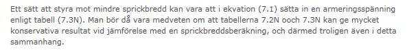 Om det gäller att begränsa sprickbredden till ett visst värde kan man använda ekvation (7.1) med en spänning enligt avsnitt 7.3.3, men denna spänning ska aldrig användas för direkt beräkning av sprickbredd enligt 7.3.4, ekvation (7.9) m.fl. Metoden i avsnitt 7.3.3 ger ofta mycket konservativa resultat.